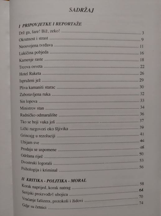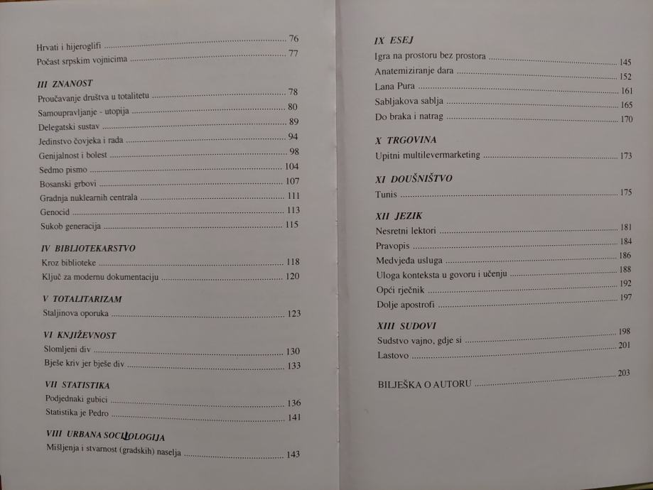 Niz crtica, članaka, anegdota i drugih kraćih zapisa koji se odnose na najraznovrsnije teme - od onih vezanih uz autorov zavičaj, preko kritike društvene stvarnosti, politike i morala, osvrta na stanje u znanosti i bibliotekarstvu, a dotiče se i totalitarizma, književnoga života, statističkih analiza, urbane sociologije, trgovine, jezične problematike i stanja u pravosuđu.
