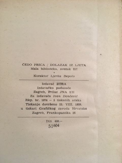 Čedo Prica, Dolazak iz ljeta, 1. izd., 1959.