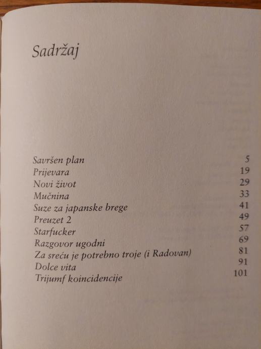 Rock-kritičar i organizator koncerata, menadžer u diskografskim kućama, Dubravko Jagatić, napisao je svoj prvi roman. Prepoznatljiva suvremena urbana priča o generaciji tridesetinešto godišnjaka, sudionika zagrebačkog "slatkog života". Likovi su sitni dileri, kazalištarci, glazbeni novovalci i njihove pratilje, a jedini im je cilj - "dolce vita".