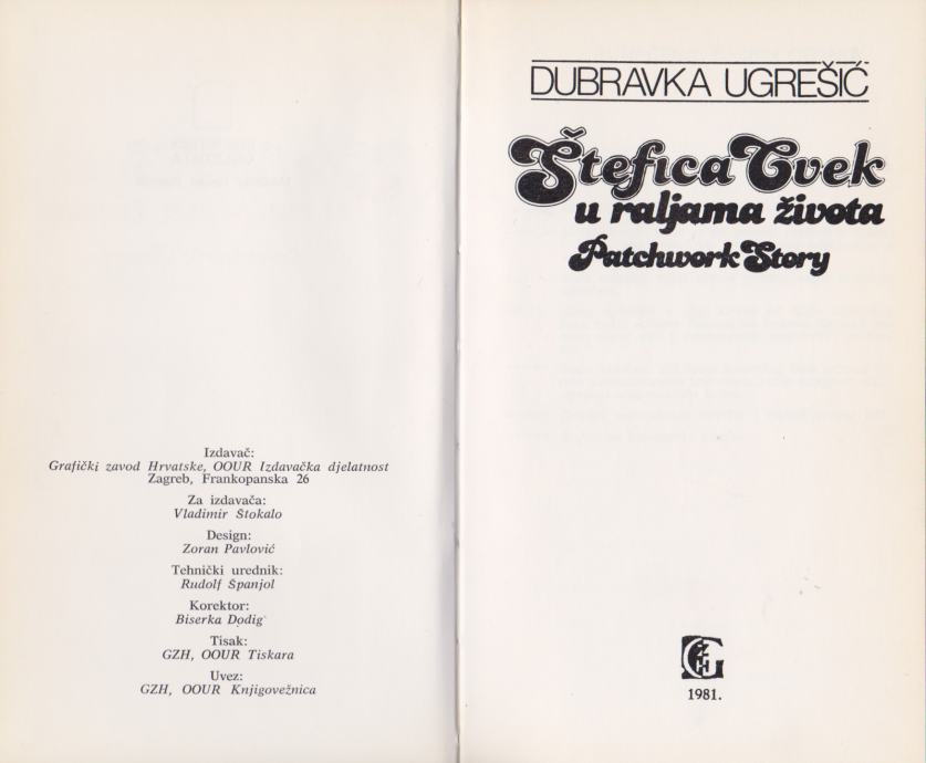 Dubravka Ugrešić: Štefica Cvek u raljama života, Patchwork Story, Grafički zavod Hrvatske, Zagreb 1981.