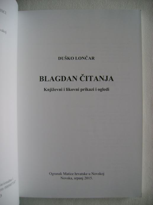 Duško Lončar - Blagdan čitanja; Književni i likovni prikazi i ogledi - izdavač Matica hrvatska, Novska 2015. godine, 15 x 21 cm, meki uvez, 160 stranica, ilustrirano, naklada 500 primjeraka.