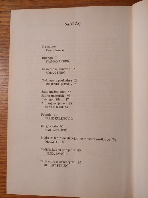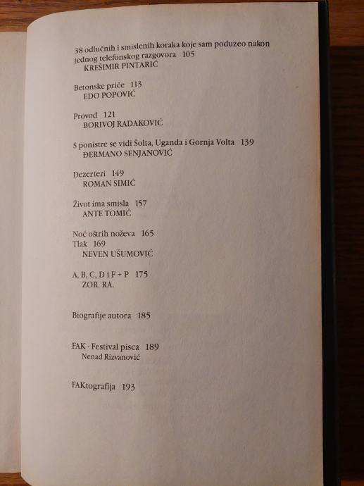 Književni radovi pisaca, njihove kratke biografije, kao i najave njihovu nastupu na Festivalu alternativne književnosti, koji se održavao u tri termina tijekom 2000. godine na tri lokacije: Osijeku, Zagrebu i Puli. Ovom prilikom objavljena su prozna ostvarenja: S. Andrića, Z. Ferića, M. Jergovića, S. Karuze, T. Kulenovića, S. Mraovića, D. Orlića, J. Pavičića, R. Perišića, K. Pintarića, E. Popovića, B. Radakovića, Đ. Senjanovića, R. Simića, A. Tomića, N. Ušumovića, te Zor. Ra.