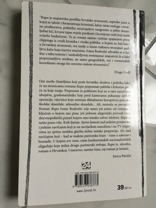 “Rupa je majstorska preslika hrvatske stvarnosti, septičke jame u kojoj se talože i fermentiraju kriminal, lažne ratne zasluge i stvarno profiterstvo, političko mračnjaštvo zaogrnuto u jeftin domoljubni kič, krvave tajne svježe prošlosti i licemjerje onih koji nude svijetlu budućnost. To je roman nastao vještim spajanjem press clippinga iz crnih kronika i visoke politike, u kojem se, baš kao i u hrvatskoj stvarnosti, sve melje u istom mikseru stvarajući gadljivu kašu koja izaziva mučninu. Ivana Bodrožić uhvatila se u koštac s tabu temom i 'nedodirljivim svetinjama' smjestivši ih u lako prepoznatljivu sredinu, ne samo geografskih, već i vremenskih koordinata onoga što zovemo našom stvarnošću.” Drago Hedl
