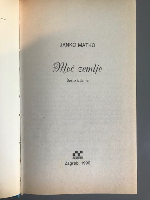 Janko Matko piše o domovini, vjeri, ljubavi, selu. Tom temom prožeta je i Moć zemlje. Glavni lik je Vera pl. Jurić, kćerka bogatog plemića Matije pl. Jurića, koji posjeduje, između brojnih imanja, dvorac Kremenicu. Dvorac se nalazi u selu nedaleko od Karlovca. Matija sa svojom obitelji redovito tamo boravi, te nadgleda radove koji se odvijaju u njegovim vinogradima i šumama. Njegove dvije kćerke su čista suprotnost. Jela, tiha, blaga, mirna i Vera, ohola, gorda, ponosna plemkinja. Karakterno je slična ocu. Njen otac i Vera misle kako su bolji od ostalih, te mrze seljake. Smatraju da su seljaci stvoreni samo kako bi obrađivali zemlju i da ništa drugo ne trebaju znati...(iz tiska)