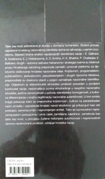 "Tijelo bez kosti" jedinstvena je studija u domaćoj humanistici. Složeni procesi uspostave hrvatskog nacionalnog identiteta njome se zahvaćaju u samim izvorištima. Slijedeći brojne analize najutjecajnijih teoretičara nacije – E. Gellnera, B. Andersona, E. J. Hobsbawma, A. D. Smitha, H. K. Bhabhe, P. Chatterjee, E. Balibara i drugih – autorica rastvara mehanizme i strategije kojima su istaknuti prvaci Hrvatskoga narodnog preporoda zamislili i proizveli platformu za djelotvorno oblikovanje hrvatske nacionalne ideje.