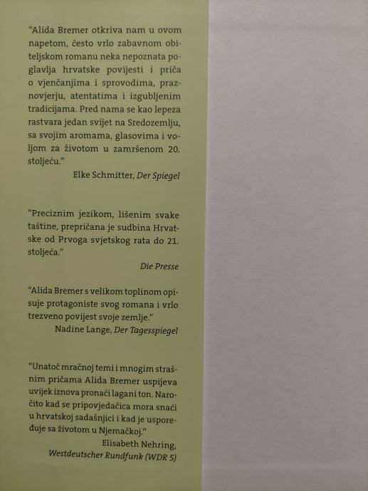 Roman je u vrijeme objavljivanja u Njemačkoj dobio izvrsne kritike (»Der Spiegel«, »Die Presse«, »Der Tagesspeigel«, »Weltdeutscher Rundfunk«), a kako u Hrvatskoj kontinuirana kritička recepcija bilo domaće, bilo inozemne književnosti jedva da i opstaje (doista, čast izuzecima poput Jagne Pogačnik, Darije Žilić, Daria Grgića, Davora Šalata, odnedavno Zlatka Kramarića) ‒ sudbina njezinoga romana, na sreću, ipak nije bilo potpuno prešućivanje. Bilo kako bilo, bjelodana je činjenica da su ‒ bar u mojoj čitataeljskoj vizuri ‒ ponajbolji romani o Dalmatinskoj zagori i Dalmaciji općenito u posljednje vrijeme napisale njemačke spisateljice hrvatskoga prodrijetla ‒ prije svih Marica Bodrožić (Tišina rastanak, Balada o zvjezdanom moru, obje u izdanju »Frakture«), a podjednako tako ovim romanom i Alida Bremer. Sâm sam se sada ugrizao za jezik jer me ama baš nimalo ne zanima kojega je podrijetla bilo koja književnica ili književnik. Ti, dakle, romani, jednostavno pripadaju velikoj, transnacionalnoj tradiciji mediteranske kulture kao izvora europske civilizacije, ali i ne samo nje i nisu nimalo zanemariv obol njezinome recentnome književnome kontinuitetu. I kako mi je oduvijek bila posve strana ideja da nečiju književnu kritiku čitate do kraja (pa i ovu moju), da bi eventualno saznali što »kritičar« ili »esejist« misli baš do zadnjega retka o često do kraja (ne)pročitanoj knjizi, na vrijeme mi je odmah napisati i upozoriti da svi oni koji na spomen Alide Bremer odmah traže uputnicu za najbližu gastroskopiju, odmah odustanu od daljnjega čitanja ovoga teksta.