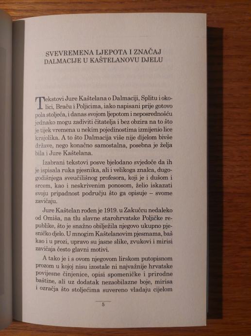 Ovo jedinstveno izdanje donosi putopisne tekstove i pjesme o Dalmaciji iz pera jednog od najznačajnijih hrvatskih pjesnika 20. stoljeća. Pjesnik prožima tradiciju, povijesne, kulturne i povijesno-umjetničke činjenice, legende i crtice iz svakodnevnog života sa lirski iznesenim opisima trenutaka, mirisa, boja i zvukova dalmatinske obale, njenih gradova i otoka. Narativni dijelovi skladno se isprepliću sa stihovima, ali i s upečatljivim fotografijama opisanih krajolika i spomeničke baštine, svjedočeći i na taj način kako su slika i riječ neodvojive sastavnice Kaštelanova književnog djela.