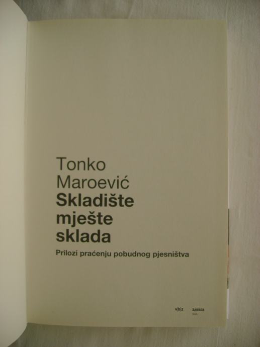 Tonko Maroević - Skladište mješte sklada - izdavač V.B.Z., Zagreb 2010. godine, 16 x 24 cm, tvrdi uvez, 251 stranica.