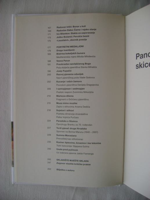 "Četrdesetgodišnji književnokritički i esejistički rad Tonka Maroevića, po njegovu vlastitom priznanju, "uskladišten" u ovoj knjizi, doznačuje nam nedogmatičnu i konzekventnu sliku ukusa ovoga autora. Pobudnost ili motivacija, kojom se rukovodio pri pisanju ovih tekstova, rezultirala je zasigurno jednim od najrelevantnijih uvida u novije hrvatsko pjesništvo.