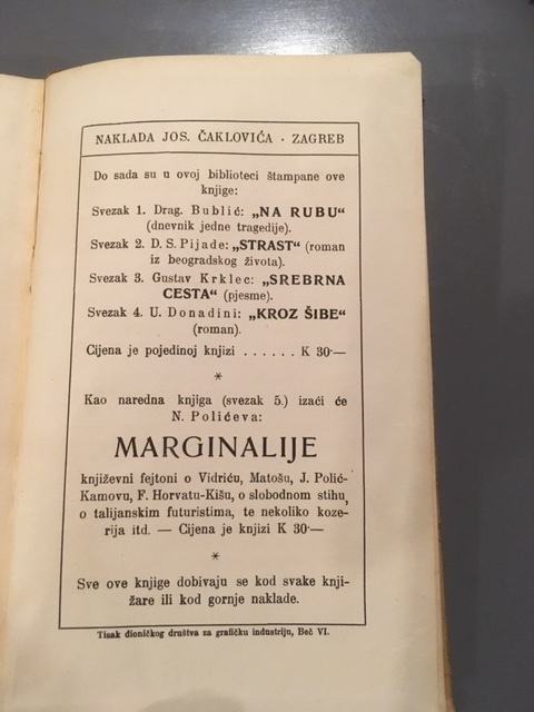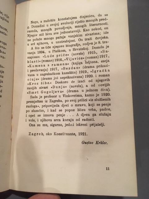 Prvo izdanje iz 1921. godine. Roman jednog od začetnika hrvatskog ekspresionizma Ulderika Donadinija. Ulderiko Donadini ( Plaški, 1894.-Zagreb,1923.) Pripovjedač, dramatičar i esejist. Zajedno sa Šimićem začetnik hrvatskog ekspresionizma . Pripadao je tadašnjim boemskim krugovima.