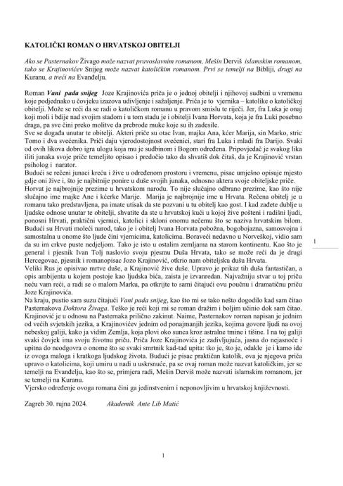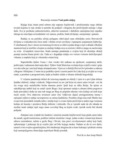 Hrvatski katolički roman pod naslovom vani pada snijeg, jako rijetko književno djelo u Hrvata. Izašao 14. prosinca 2024 godine.