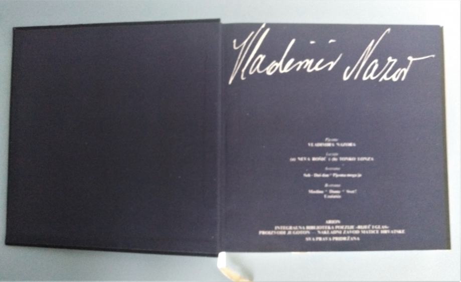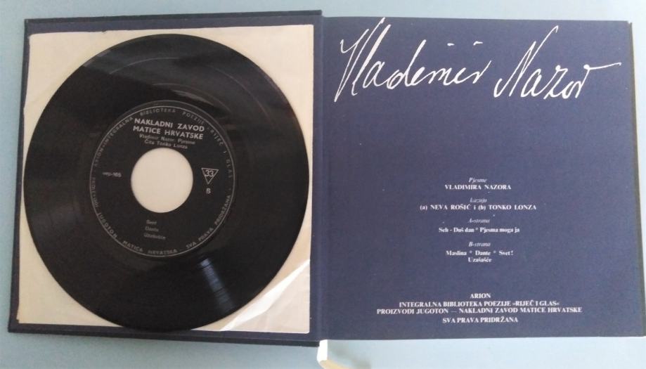 Knjiga pjesama s gramofonskom pločom Vladimira Nazora u izdanju Nakladnog zavoda Matice Hrvatske. Izdanje integralne biblioteke poezije Arion „Riječ i glas“, 1975. godina. Pjesme na A strani gramofonske ploče recitira Neva Rošić, a na B strani Tonko Lonza. Na A strani ploče su pjesme: Seh duš dan i Pjesma moga ja. Na B strani ploče su pjesme: Svet, Dante i Uzašašće. Knjiga i gramofonska ploča su odlično sačuvani, omot je u vrlo dobrom stanju. Tvrdi uvez.
