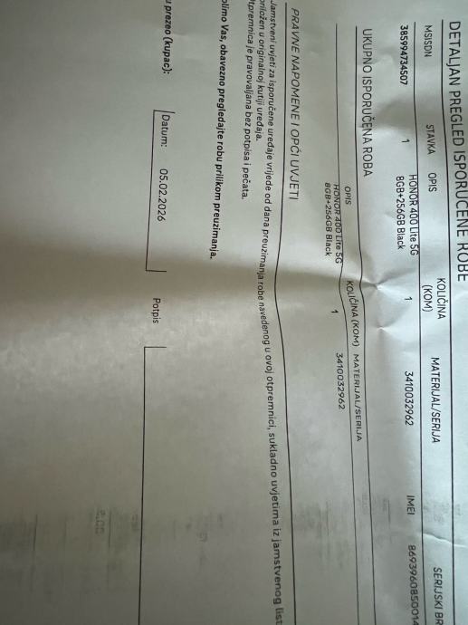 Prodajem HONOR 400 LITE 5G s 8GB RAM-a i 256GB interne memorije. Uređaj dolazi zapakiran s energetskom oznakom B, kapacitetom baterije od 1400mAh i certifikatom zaštite IP64. Podržava 5G mrežu za brze mobilne podatke.