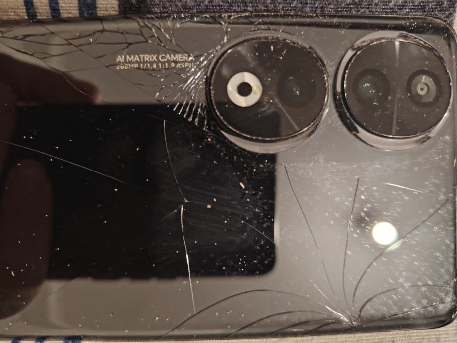 Honor 90, zadnje staklo razbijeno, ali ne smeta niti najmanje za rad. Maskica ga skroz pokrije. Popravak je 30e.