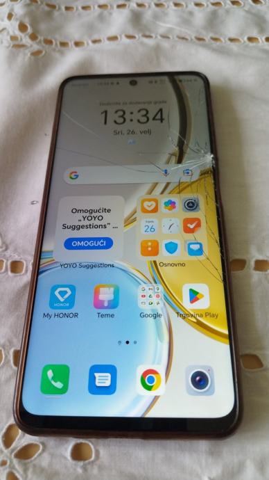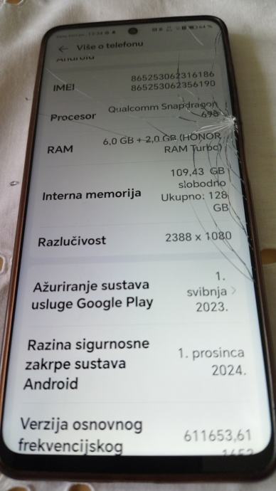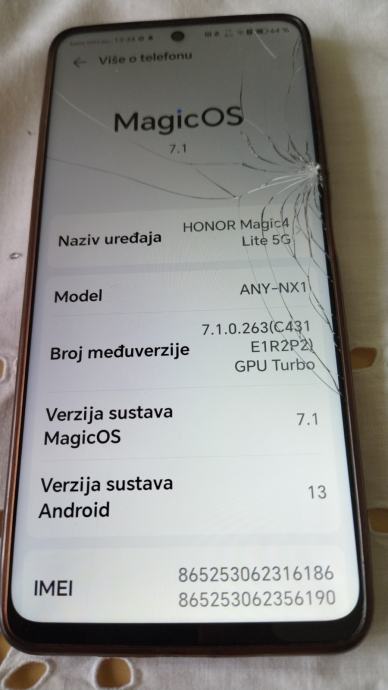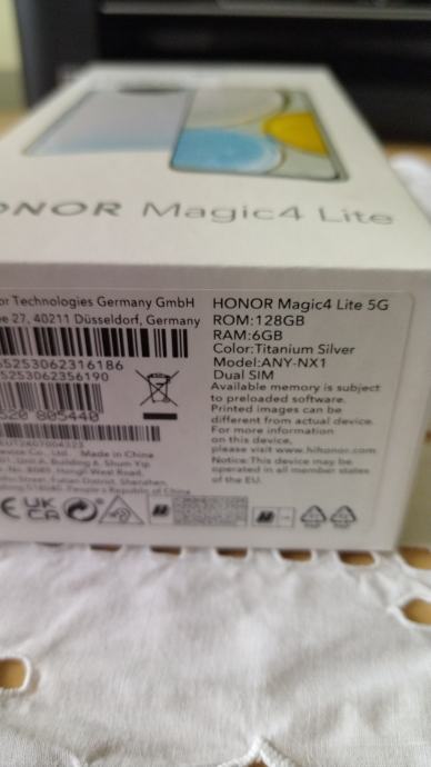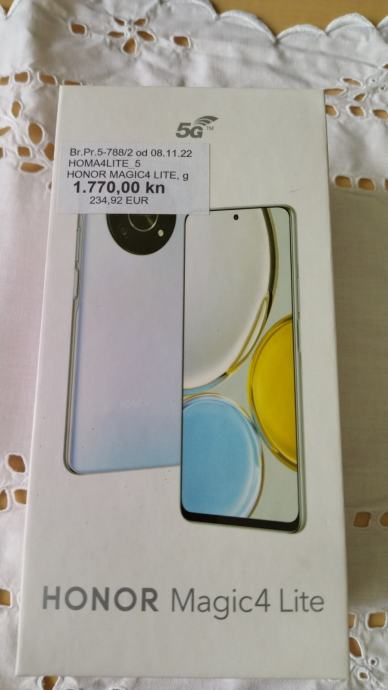 Honor Magic 4 Lite 5 G,sa oštećenjem na dijelu ekrana/ne utječe na puni rad/,sa kutijom,original maskicom,iglicom i punjačem.RAM 6 GB+2 GB/ 128 GB, 6.81 inch, 48+2+2+16 MP, 4800 mAh, 66 W žičano, 5 G, android 13, Bluetooth 5.1, 2x2.2 GHz+6x1.7 GHz.Tko se ne misli hvaliti lijepim ekranom a želi veliki mobitel sa odličnom kamerom koja daje odlične slike te velikim RAMOM i 128 GB pohrane a sa SD karticom i puno više za male novce u odnosu na nabavnu cijenu,javite se preko Njuškala ili porukom.Gratis slušalice.Šaljem isključivo Tiskom/3 EUR/uz prethodnu uplatu.