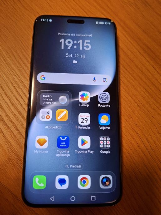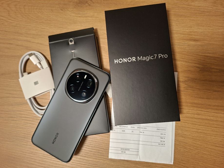 Prodajem Honor Magic 7 Pro s 12GB RAM-a i 512GB interne memorije. Telefon je u crnoj boji s karakterističnim dizajnom stražnje kamere.