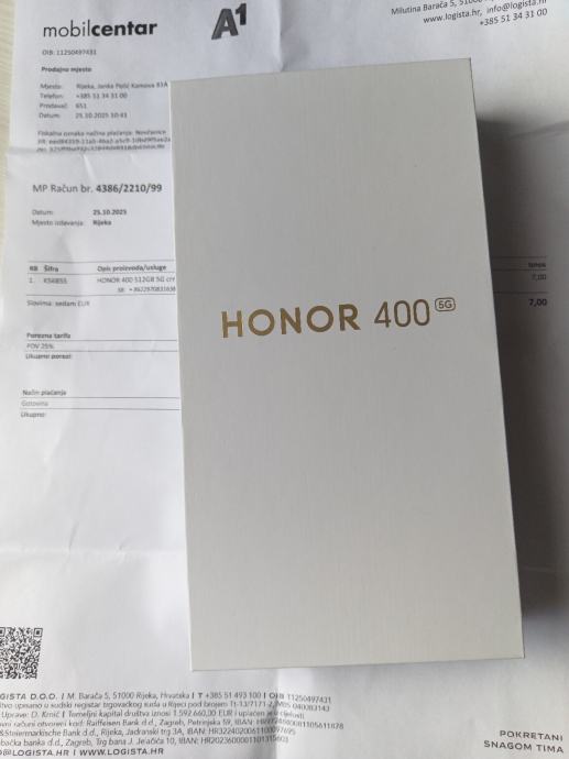 Prodajem Honor 400, crna boja, sa 512GB memorije, kupljen 25.10.25, mobitel kao nov u top stanju, folija na ekranu, na poklon Huawei free bude 6i slušalice, račun i garancija 2 godine