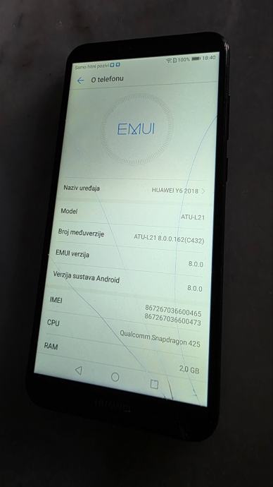 Huawei Y6 2018, 2/16GB, oštećeno staklo, funkcionalan!