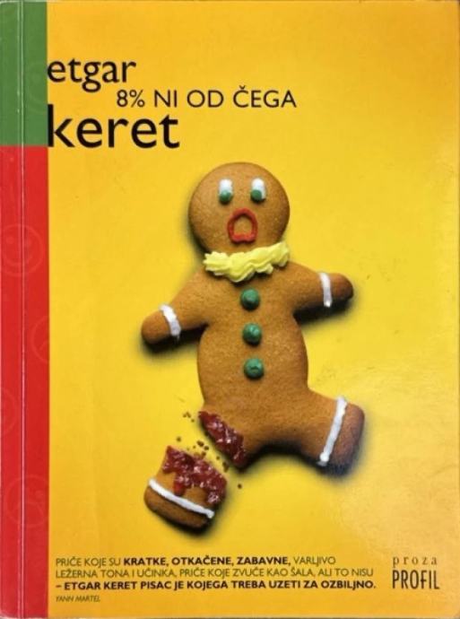 Ovom zbirkom sjajnih, kratkih, satiričnih priča, u hrvatski jezik zakoračio je najhvaljeniji i najprodavaniji mladi izraelski autor Etgar Keret. Bolno duhovite i provokativne, ponekad razorne, ali uvijek tople, priče iz "8% ni od čega" naizgled su toliko jednostavne da knjiga podsjeća na malu zbirku prosvjetljenja. Jer, o čemu god da priča, Keret to radi do dna, ne libeći se dirati u najbolnija mjesta - ali iz srca i s osmijehom, potvrđujući status jednog od najvećih pisaca i glas savjesti Izraela.