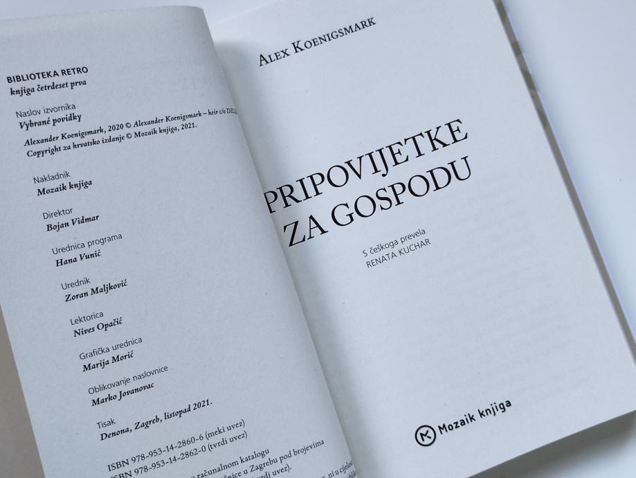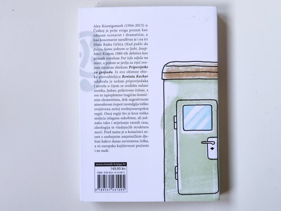 Alex Koenigsmark (1944-2013) u Češkoj je prije svega poznat kao iskusan scenarist i dramatičar, a kao koscenarist surađivao je i na tri filma Rajka Grlića (Kud puklo da puklo, Samo jednom se ljubi, Josephine). Krajem 1980-tih debitira kao prozaik novelom Put šefa odjela na more, a potom se javlja za riječ svojom slavnom zbirkom Pripovijetke za gospodu. Iz ove obimne zbirke prevoditeljica Rentata Kuchar odabrala je sedam pripovijedaka i novela u čijem se središtu nalaze erotika, ljubav, prikrivene čežnje, a sve to isprepleteno tragično komičnim elementima, dok sugestivnom atmosferom treperi nostalgija toliko svojstvena našoj srednjoeuropskoj regiji. Onoj regiji što je kroz toliko stoljeća izlagana sukobima, ali jednako tako i miješanju raznih rasa, ideologija te vladajućih struktura moći. Pred nama je u konačnici susret s osebujnim umjetničkim djelom kakvo danas suvremena češka, a ni europska književnost prečesto i ne nudi.