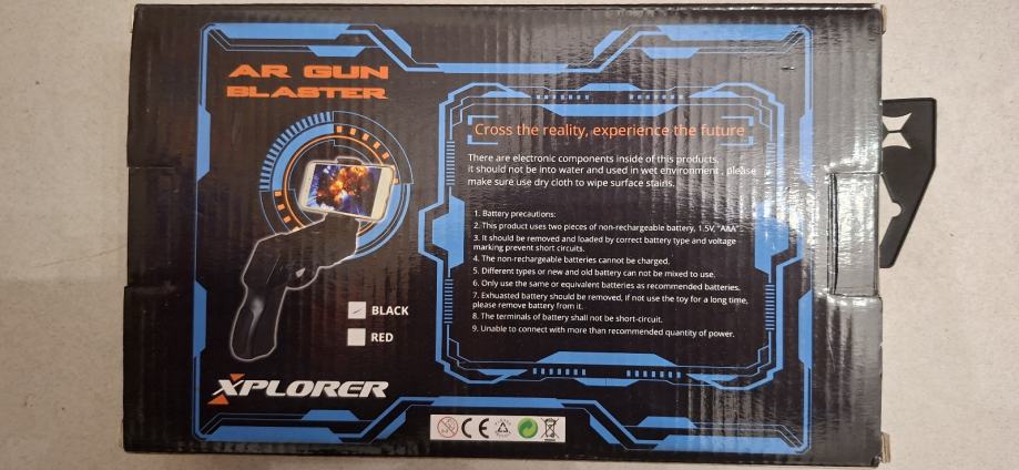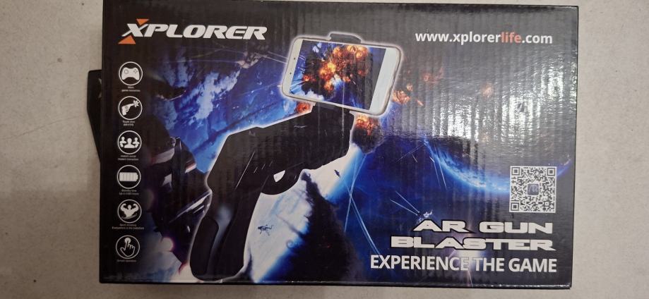 Prodajem novi Xplorer AR Gun Blaster, kontroler u obliku pištolja namijenjen igranju AR igara na smartphoneu. Telefon se postavlja u držač na vrhu uređaja, a igra se kontrolira pokretima i gumbima na kontroleru. Crna boja.