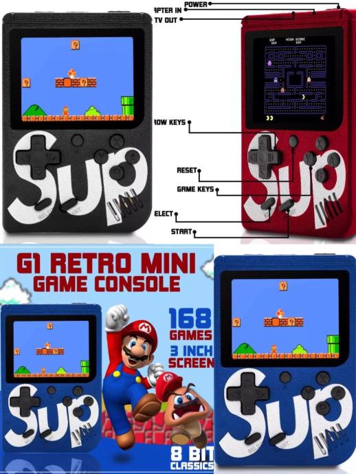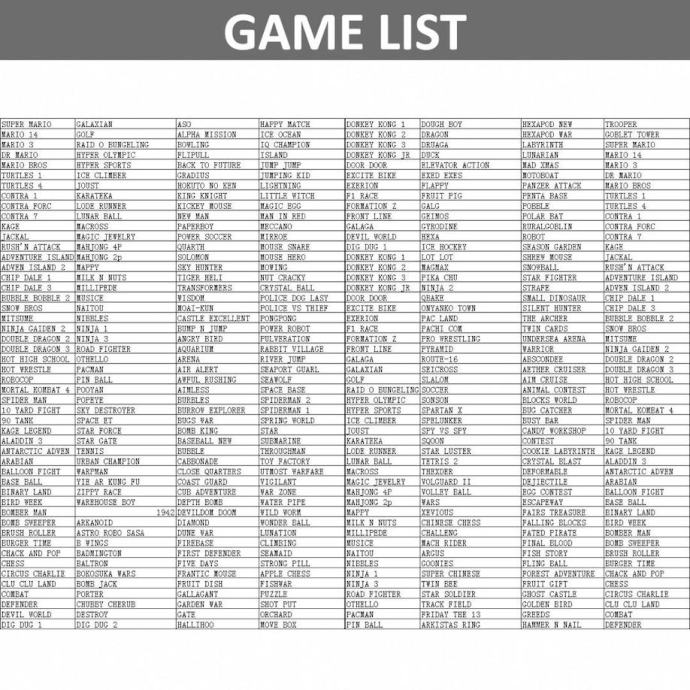 ➡️ Neke od igrica su: Super Mario, Donkey Kong, Pacman, Mortal Kombat, Turtles, Aladdin, Robocop, Adventure Island, 90 Tank, Pika Chu, Double Dragon, Bomber Man, Galaxian, Tetris…