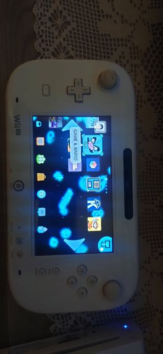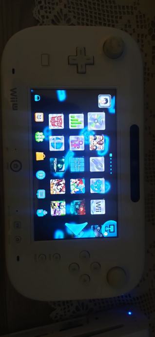 Prodajem Nintendo Wii U konzolu u bijeloj boji, modificiranu. Konzola dolazi s GamePad kontrolerom koji ima ugrađeni zaslon osjetljiv na dodir. Na uređaju je vidljiv veći broj instaliranih igara, među kojima su naslovi poput Super Mario Makera, Splatoon i drugi.