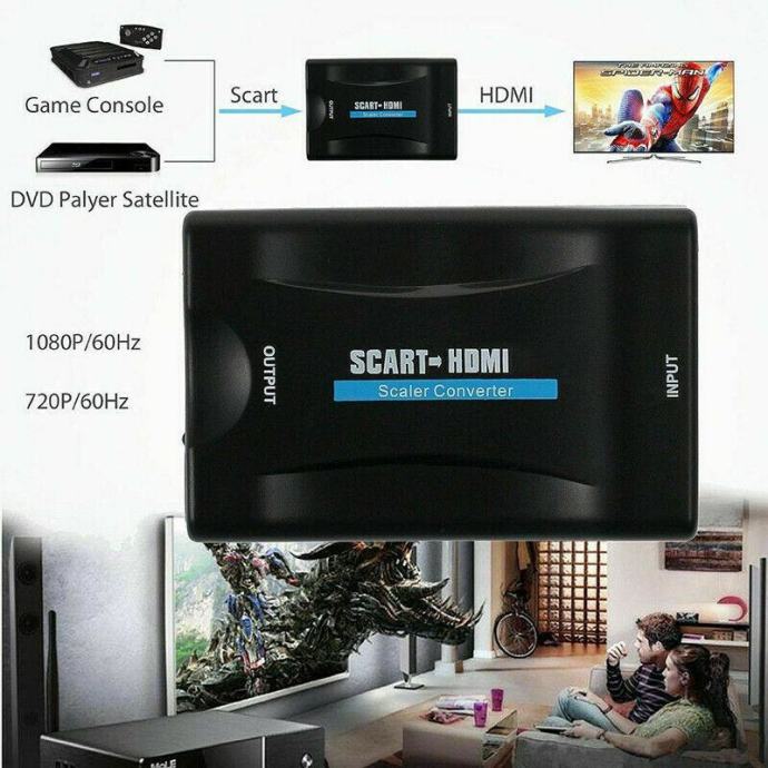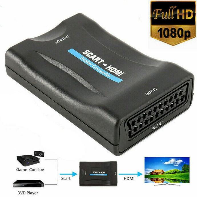 Konverter za spajanje raznih uređaja sa SCARTA na HDMI, Ima sklopku za podešavanje izlazne rezolucije video signala 1080P/720P.