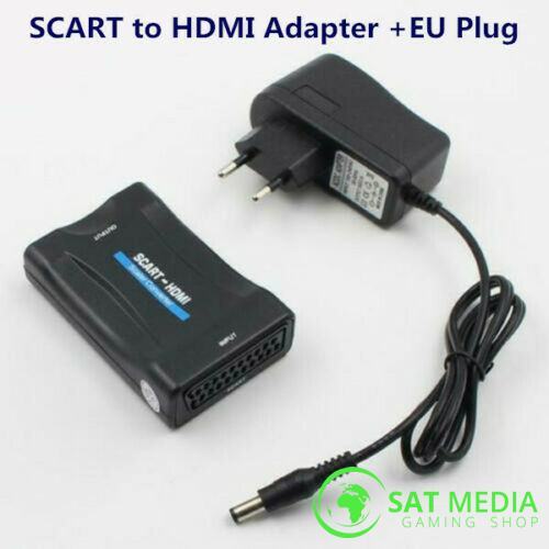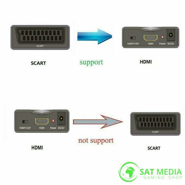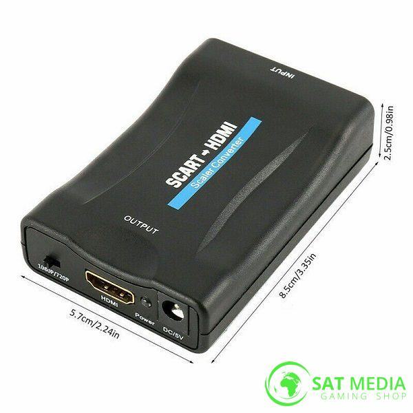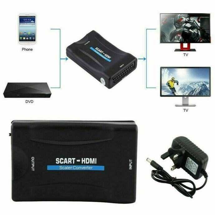 Converter za spajanje raznih uređaja sa SCARTA na HDMI, Ima sklopku za podešavanje izlazne rezolucije video signala 1080P/720P. Converter dolazi u kompletu sa strujnim adapterom.