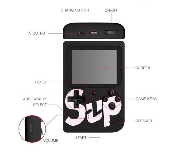 SUP Retro Classic Mini Game Console, 400 in 1 Game Box, ručna video igrica sa 400 klasičnih retro naslova, vratite se u prošlost i zaigrajte opet originalne igrice kakve su nekad bile Mario, Super Mario, Pacman, DR Mario, Contra, Turtles, Galaxians, Space Invaders, Tank, Bomber man, Pin Ball, 1942, Arkanoid, Pac Land, Tetris, Paperboy i ostale.