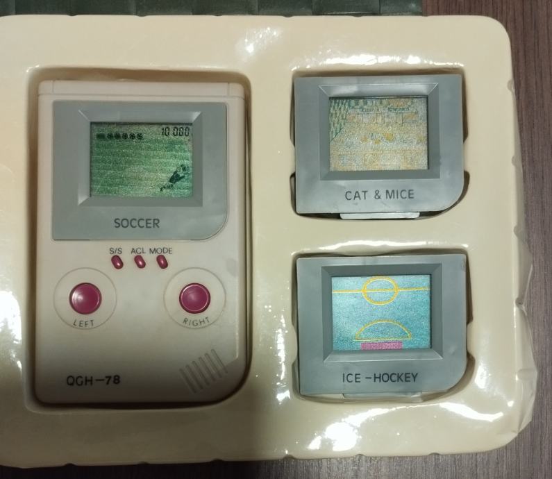 Video igrica "QGH 78" sa početka '90-ih godina. Igrica je ispravna. Igrica ima tri catridga sa različitim igricama (nogomet, hokej, mačka i miš) koji se jednostavno mijenjaju. Uz nju se dobiju i dvije nove baterije (jedna je u igrici a druga u original pakiranju nekorištena). U Zagrebu moguće osobno preuzimanje.