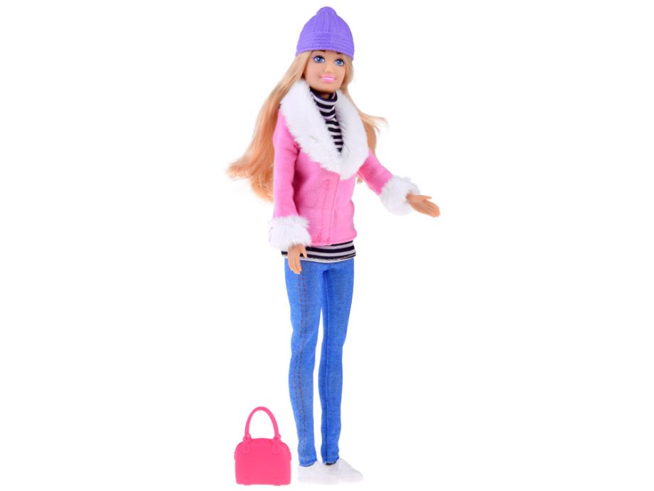 Elegantna lutka duge plave kose odjevena u zimski stil svidjet će se svakoj djevojčici. Lutka ima prekrasnu dugu kosu koja se može oblikovati u moderne frizure, a na glavi ima ljubičastu zimsku kapu. Nosi elegantnu ružičastu jaknu obrubljenu bijelim krznom, a ispod jakne lutka nosi prugastu dolčevitu. Na dugim nogama ima plave tajice, a na nogama bijele brendirane tenisice. Cjelinu nadopunjuje ružičasta torbica. Lutkini udovi su pokretni, lice ima nasmijano lice i plave oči.