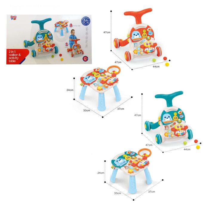 Ova guralica za učenje prvih koraka kombinira guralicu i ploču za igru. Guralica potiče dijete da primjenjuje uravnoteženu silu na oba stopala dok gura hodalicu. Piramidalna struktura omogućuje tri točke za podupiranje tijela. Stražnji kotači mogu se podesiti na odgovarajuću brzinu kako bi se zadovoljile potrebe bebe u različitim fazama hodanja. Odvojiva ploča aktivnosti sa raznim efektima i funkcijama poput zupčanika, knjige, vodilica za igru i učenje vašeg mališana.
