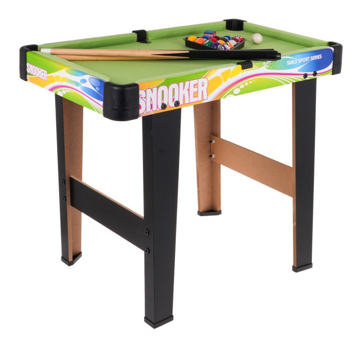 Sjajan stol za bilijar s dodacima za djecu iz 8 godina starosti. Stol je izrađen od čvrstih materijala (MDF ploča) s pažnjom na detalje. MDF ploča je otporna na ogrebotine i deformacije. Površina stola bila je prekrivena zelenim platnom. Na rubovima su rupe u koje se mogu umetnuti loptice.