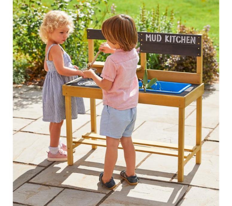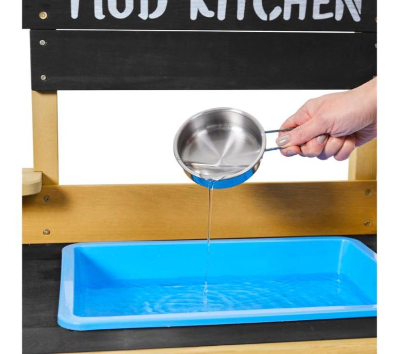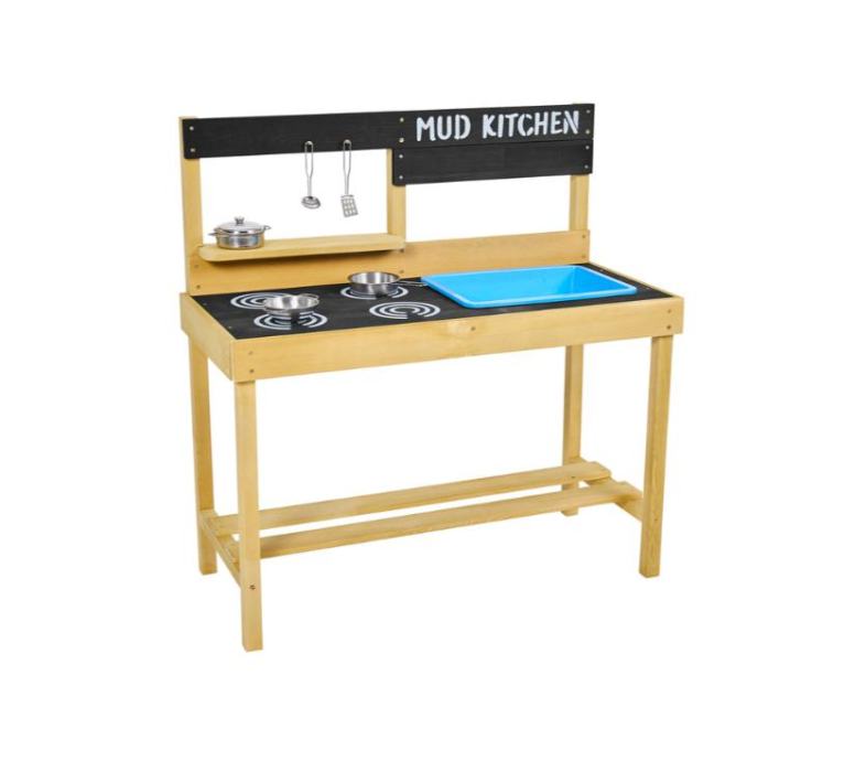 Ova drvena kuhinja ima obojenu ploču za kuhanje, plastični sudoper koji se može ukloniti, police za lonce, radnu plohu, pa čak i praktičnu policu za spremanje uključenih dodataka od nehrđajućeg čelika!