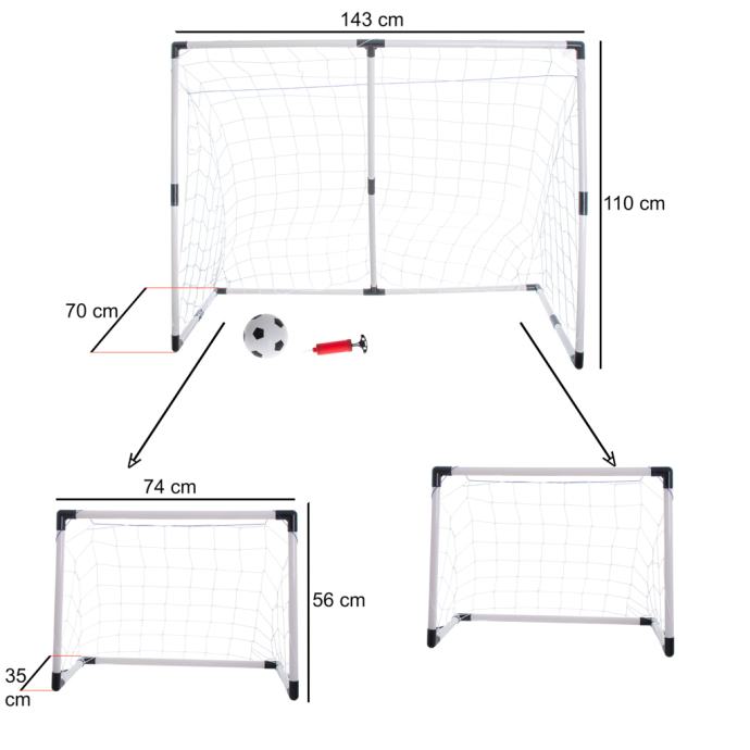 Veliki gol je dimenzija 143 cm x 110 cm x 70 cm, dok je jedan manji gol dimenzija 74 cm x 55 cm x 35 cm.
