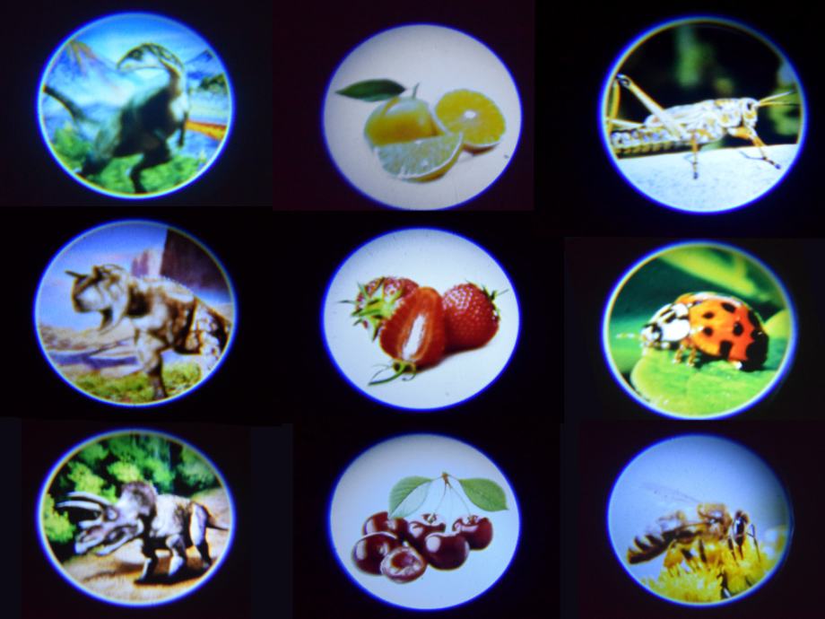 Dječji projektor sa šarenim slikama za prikaz u mraku. Zahvaljujući maloj veličini, praktičan je i uvijek ga možete ponijeti sa sobom gdje god idete. Uvijek ga možete imati sa sobom, primjerice: u sobi kad navečer zaspite, pod šatorom na odmoru, kod bake i djeda tijekom vikenda. Ručni projektor koristit će se tijekom večernjih igara, pričanja, kreiranja vlastitih priča. 3 diska s slajdovima učinit će da gadget ne dosadi brzo. Svaki štit sadrži 8 slika s različitim temama. Na prvoj su razni dinosauri, na drugoj kukci, a na trećoj voće. Bez postavljanja slajdova, može se koristiti kao svjetiljka za osvjetljavanje mračnih kutova sobe u večernjim satima.