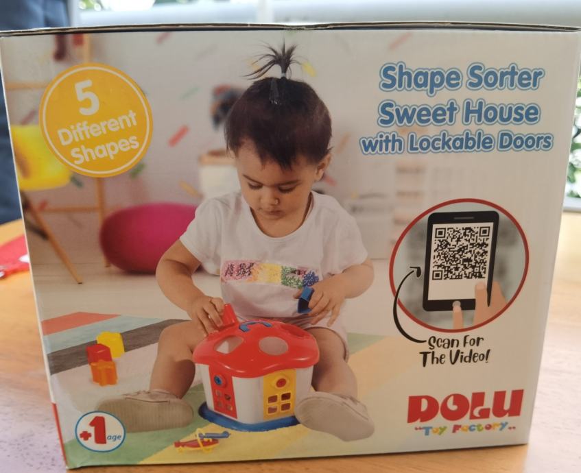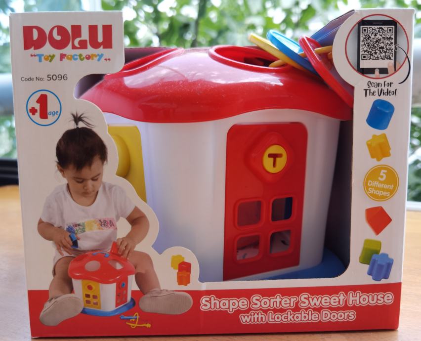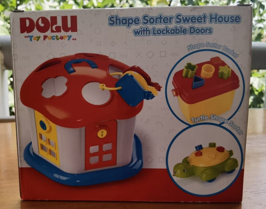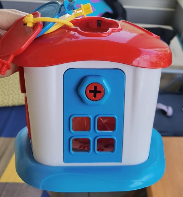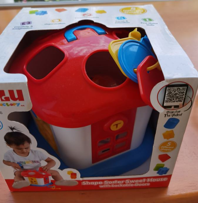 Nikad korištena zapakirana u kutiji DOLU KUĆA S OBLICIMA ZA UMETANJE I KLJUČEVIMA Stimulira i razvija kognitivne sposobnosti djeteta. Kombinacija početnog sortiranja oblika (4 vrste) s dvije strane kocke te korištenjem ključeva za otvaranje s četiri strane. Namijenjeno djeci starijoj od 6 mjeseci.