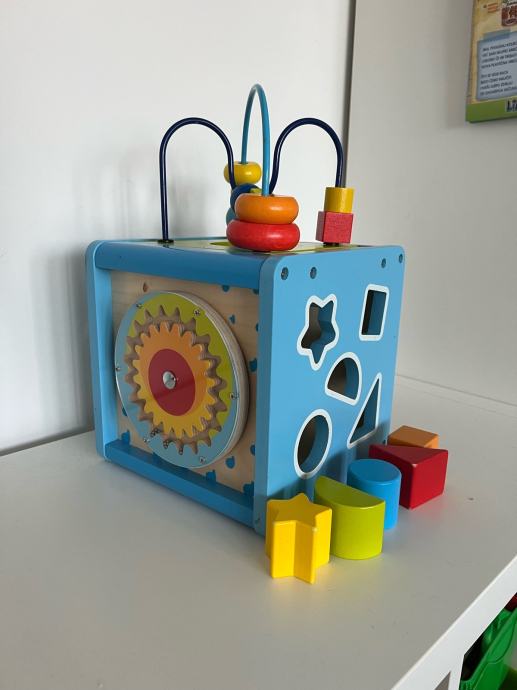 Prodajem drvenu didaktičku kocku čija svaka strana nudi drugu zanimaciju za bebu.