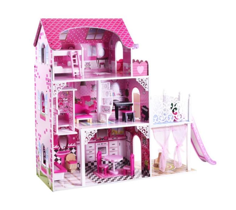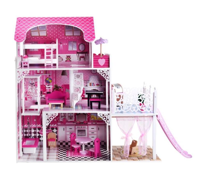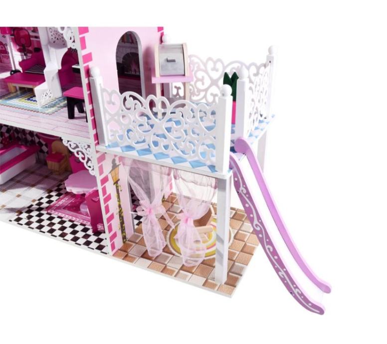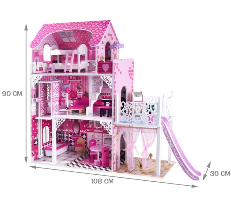 Šarmantna drvena kućica za lutke s namještajem san je svake djevojčice. Kuća nevjerojatno impresivne grafike, s otvorenim stepenicama, ogradama, ukrasima zasigurno će impresionirati novog vlasnika ove vile. Vikendica je opremljena svim potrebnim namještajem potrebnim za funkcioniranje. Dodatna prednost kućice je lift i ono što djeca najviše vole - tobogan za lutke!