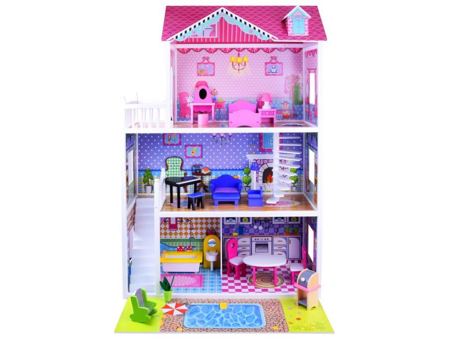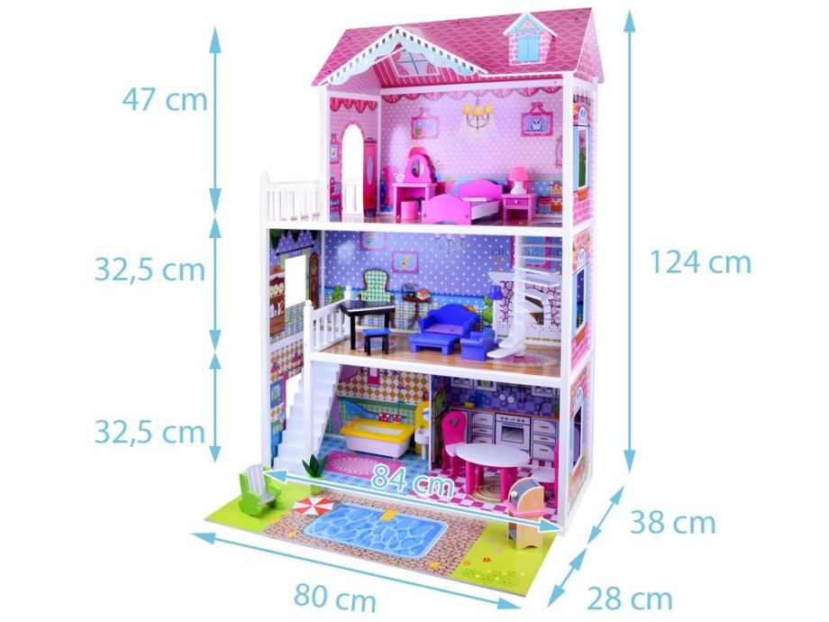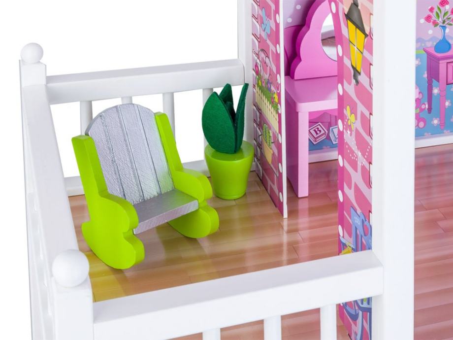 Tko ne bi želio tamo živjeti ? Ova prekrasna drvena kućica za lutke na tri kata potpuno je opremljena i ima velike prostrane sobe u kojima možete stalno preuređivati prekrasan drveni namještaj i dodatke.