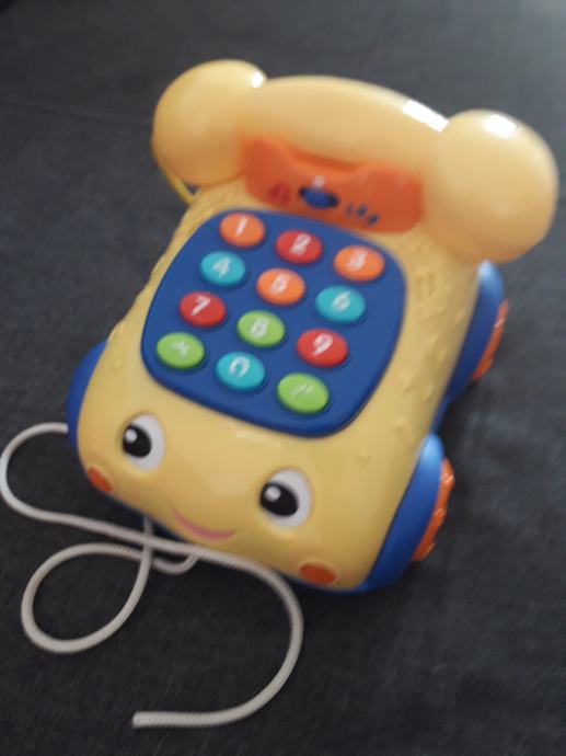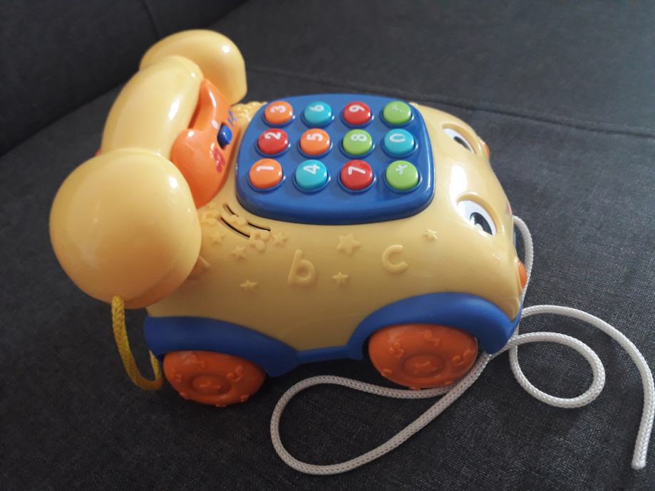 Edukativni telefon na vuču sa 2 načina za igru: muzički sa 10 živahnih melodija i edukativni sa 0 - 9 tipki za učenje numeričke identifikacije (na Njemačkom jeziku). Kad se vuče, oči se pomiču u lijevu i desnu stranu.