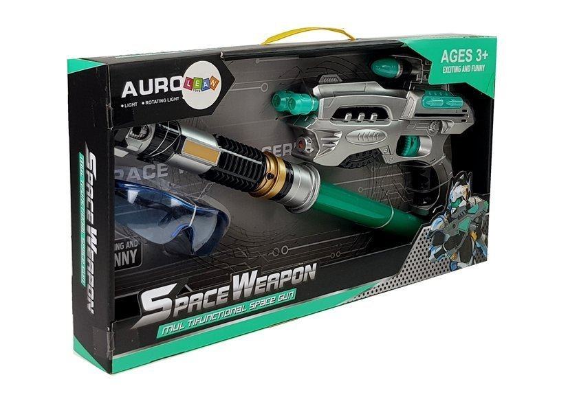U setu se nalazi pištolj koji daje zvuk pucanja kada pritisnete okidač, dodatno ima svjetlosne efekte, a cijev se pomiče naprijed-natrag. Sljedeći element je mač koji se pruža naprijed, što ga čini dugim do 80 cm. Kada je uključen, proizvodi zvukove ravno iz galaksije i svijetli bijelim svjetlom kroz tirkizni pokrov. Zaštitne naočale za igru štite od pucnjave tijekom igranja. Cijeli set je u crnoj, srebrnoj i tirkiznoj boji.
