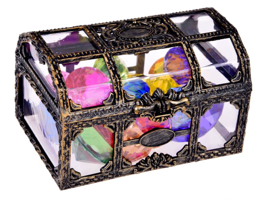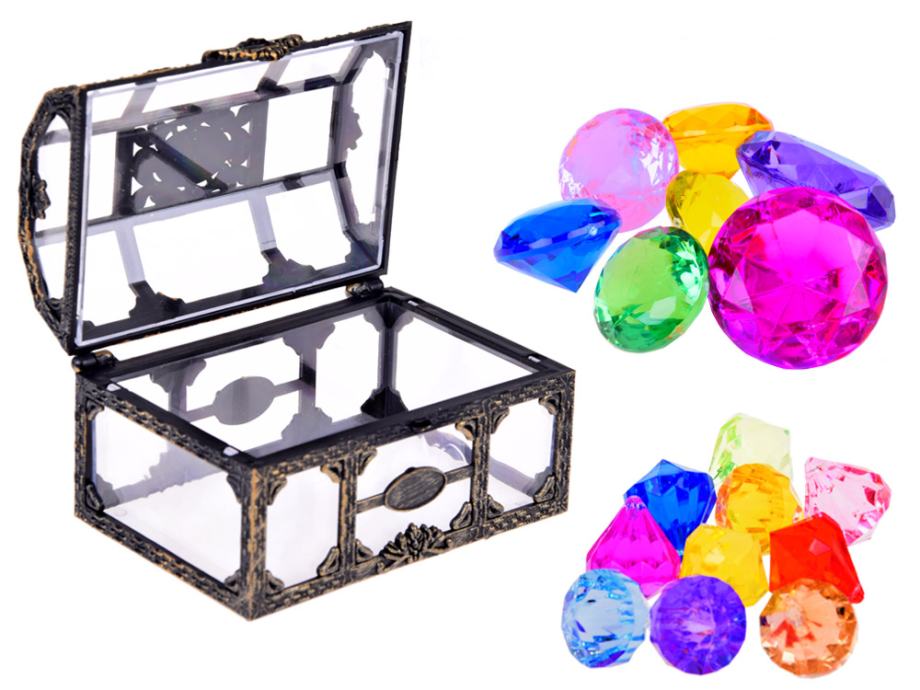 Škrinja sa šarenim kristalima - Otkrijte podvodno blago, prijedlog za igranje gusara, lovaca na blago ili za ljubitelje svega što blista :) Kutija za igračke s ukrasima krije tajanstveno, čarobno blago! Čak 17 šarenih kristala različitih veličina koje je potrebno zaštititi od nepozvanih gostiju! Predmet je u potpunosti izrađen od plastike (uključujući i drago kamenje) pa se s njim možete igrati u vodi jer nikada neće zahrđati! Naš zabavni prijedlog je da bacite kristale na dno kade ili bazena i zaronite za njima! Još jedna opcija za avanturu je sakriti škrinju s draguljima u vrtu ili kući i nacrtati kartu koja pokazuje put do fantastičnog blaga. Ovaj predmet će zasigurno potaknuti maštu vašeg djeteta, razviti kreativnost, ali i uvući ga u čaroban svijet avantura. Igračka se može koristiti na mnogo načina i na raznim mjestima - u bazenu, kadi, kući ili vrtu.