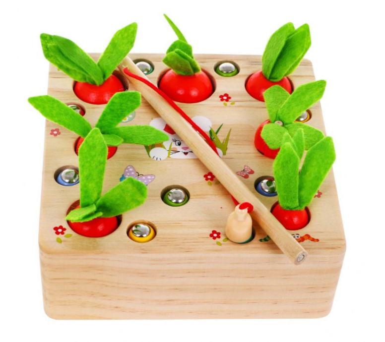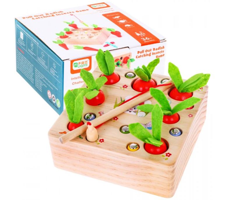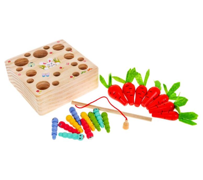 Igračka je namijenjena djeci od 3 godine. U potpunosti je izrađen od drveta, obojan sigurnim, netoksičnim bojama u živim bojama koje privlače djetetovu pozornost i potiču igru. Igra podržava intelektualni razvoj. Dijete mora ubaciti mrkvu i crve različitih veličina u odgovarajuće rupe. Crvi na krajevima imaju magnet, a set uključuje drvenu šipku također s magnetom. Možete igrati sami ili u grupi. Uklonite sve gliste štapom za pecanje kako ne bi ugrozile rastuću mrkvu, a zatim pokupite mrkvu.