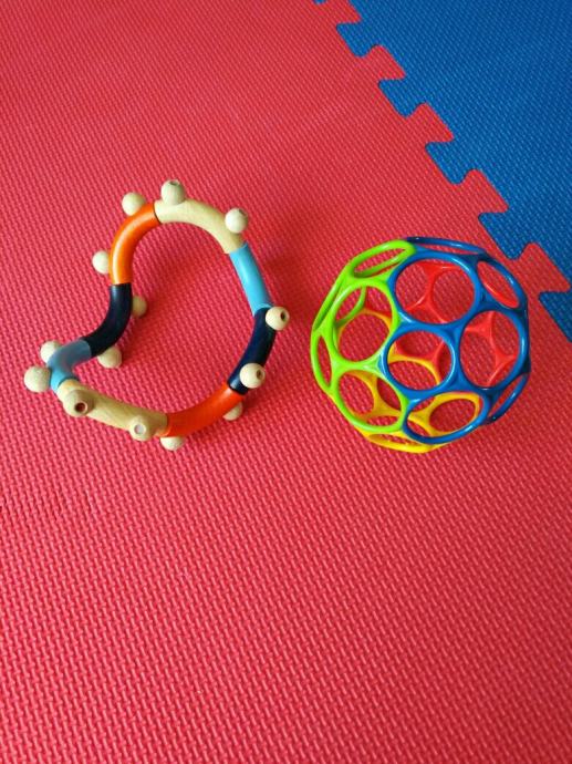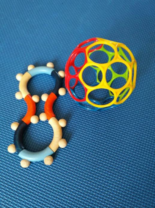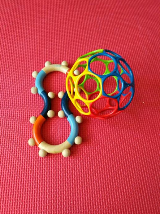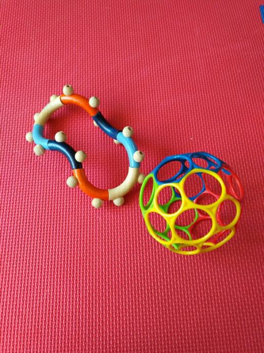 Igračka loptica za bebe + grickalica na poklon, loptica je kupljena u Mulleru, super igračka za bebe i malu djecu koja prstićima istražuju rupice i boje na lopti, grickalica je drvena, Babylove iz dm-a, korištena, također super za razvoj znatiželje i koordinacije oko-ruka jer se može slagati na razne načine.