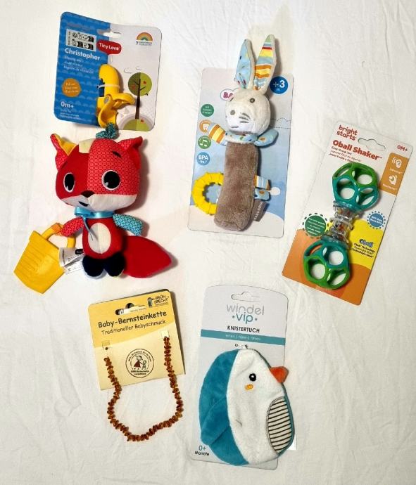 Nove igračke za bebe i jantarna ogrlica za zube. U cijenu uračunata poštarina.