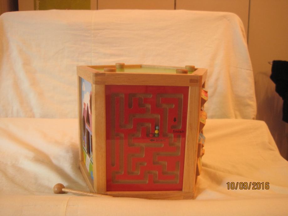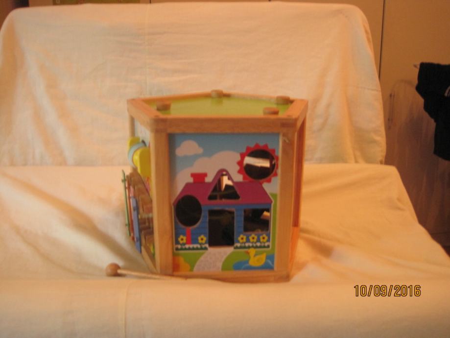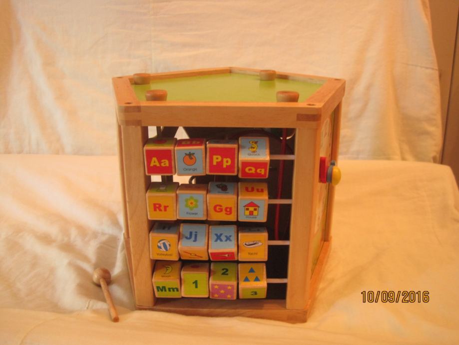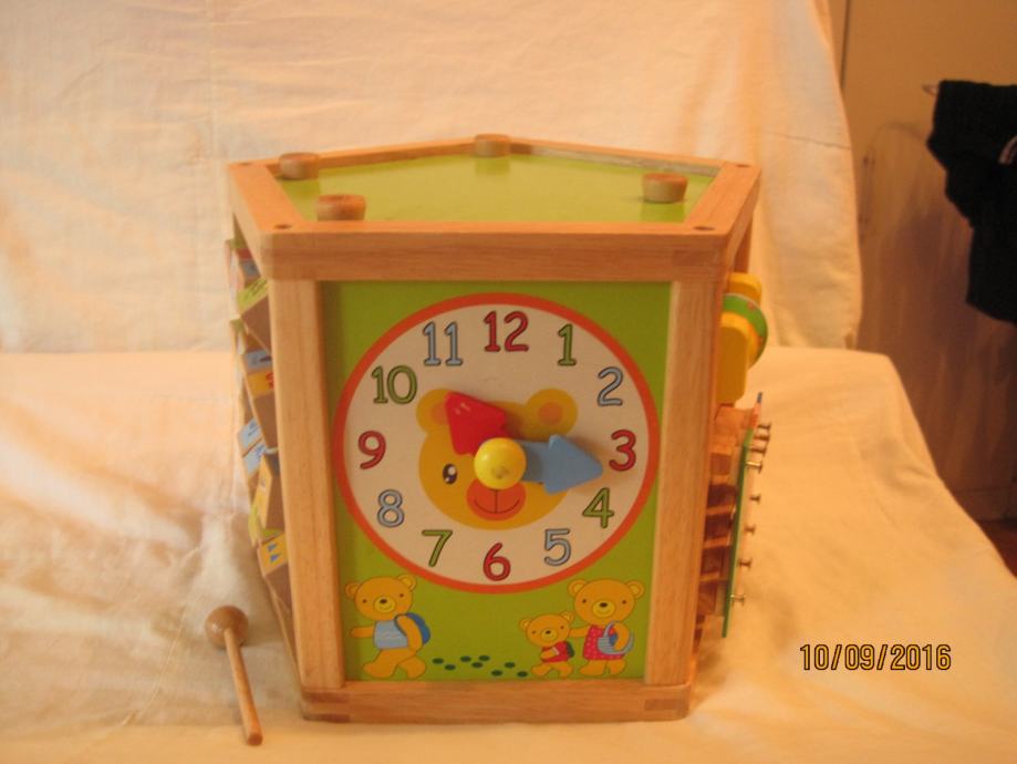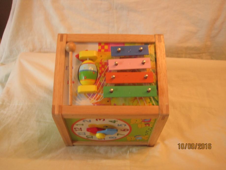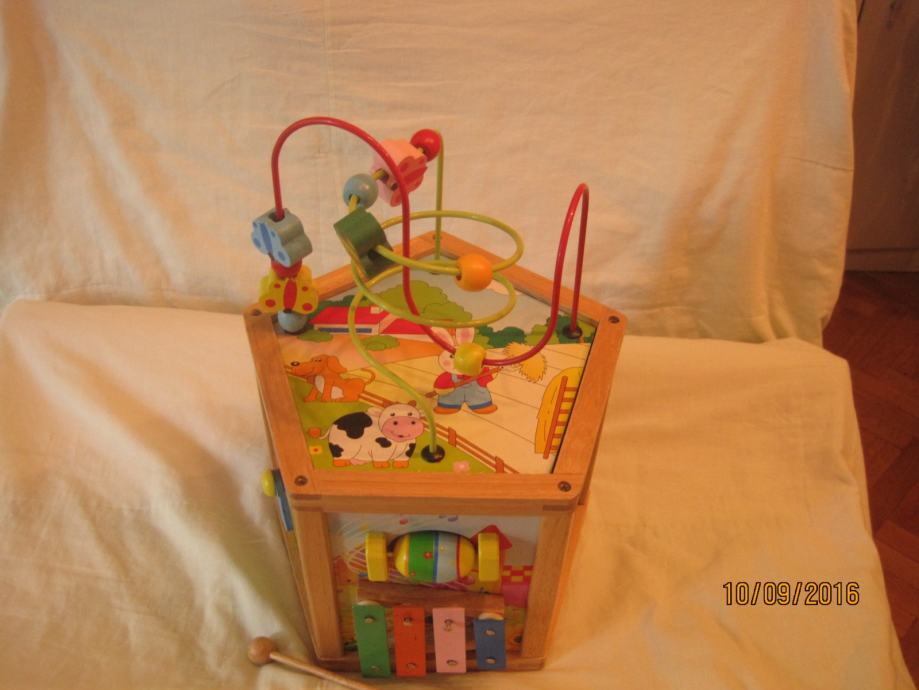 Interaktivna drvena igračka 6 u 1. Dijete okrećući igračku bira između 1 od 6 igara. Svaka stranica ove igračke nudi svoju igru - od glazbenih udaraljki, preko vježbanja fine motorike ruku provlačeći različite drvene oblike po metalnim šipkama, do gledanja na sat, umetanja različitih oblika u utore, vođenje kuglica magnetnim štapićem...