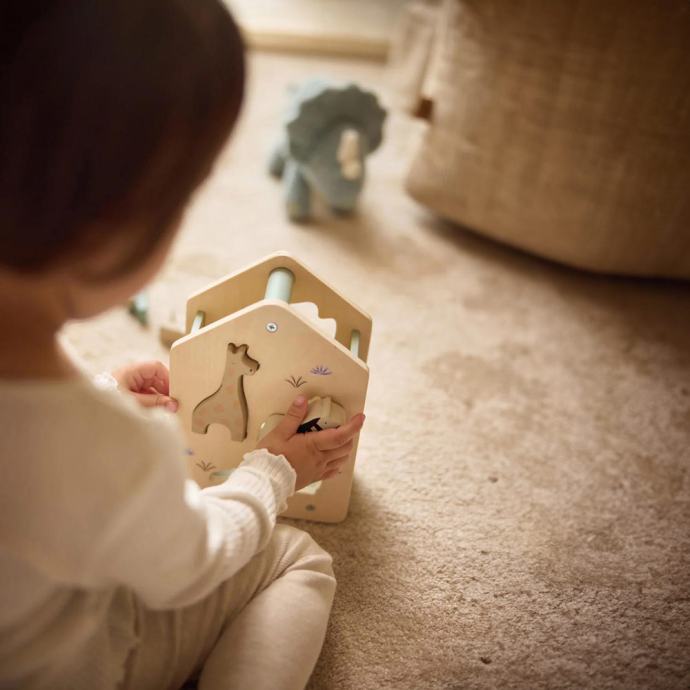 Neka vaše dijete okupi sve životinje iz džungle u ovoj zabavnoj drvenoj kućici i uživa u satima igre. Svaka od 7 životinja ima svoja "vrata" za ulaz u kućicu što za vašeg mališana predstavlja pravi izazov. Igranje s drvenim igračkama pomaže u razvoju finih motoričkih vještina, a ova kućica za igru sigurno doprinosi tome! Svo drvo u ovoj slagalici je 100% FSC certificirano.