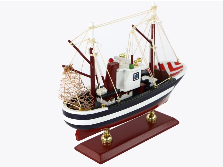 Ovaj model kolekcionarskog broda jedinstveno je djelo rukotvorine. Postavljen je na čvrste drvene noge što mu daje eleganciju i sofisticiranost. Brod je tamnoplave boje s crvenim i bijelim prugama, što mu daje klasičan nautički izgled.